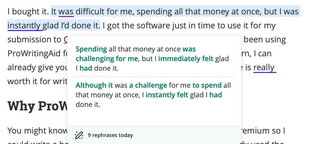 Funnily enough, I had never used ProWritingAid before, but I was subscribed to their emails because of their writing events. Despite the positive reviews I had heard about the software, I used Grammarly instead because its free version was much more robust.